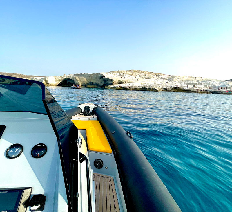 Παραλία Πολύαιγος – Γαλάζια νερά. Το μεγαλύτερο ακατοίκητο νησί είναι η Πολύαιγος. Μόλις λίγα μίλια μεταξύ Μήλου και Κλέφτικο. Ένα παρθένο τοπίο με εξαιρετικές παραλίες. Αν δοθεί σε κάποιον η ευκαιρία να εξερευνήσει αυτό το νησί στην ενδοχώρα, θα ανακαλύψει ότι το νησί ουσιαστικά δεν ήταν ποτέ ακατοίκητο… Η παραλία που θα επισκεφτείτε έχει τα πιο καθαρά νερά με δυνατότητα να εξερευνήσετε τον βυθό ακόμα και σε βάθος 20 μέτρων. Εκεί θα μπορείτε να χρησιμοποιήσετε τις μάσκες που παρέχει το σκάφος μας και να ενεργοποιήσετε τον διακόπτη του σκούτερ θαλάσσης ώστε να εξερευνήσετε όλες αυτές τις ομορφιές που πραγματικά θα σας ενθουσιάσουν.